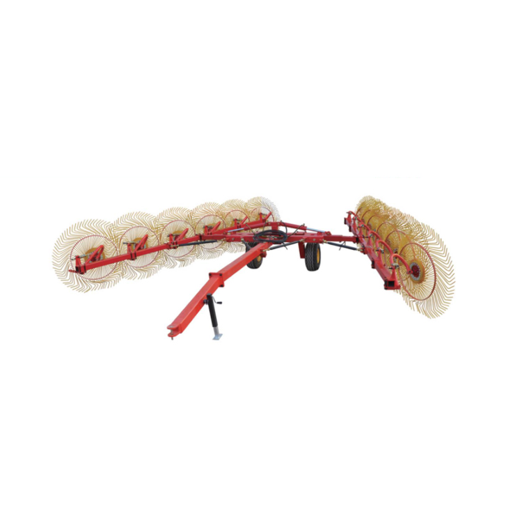 Srpski језик3-punktowe zgrabiarki do siana China Tractor mają solidną czerwoną metalową ramę. Po obu stronach ramy rozmieszczono symetrycznie wiele zestawów złotych obrotowych tarcz, z których każdy składa się z promieniujących, elastycznych stalowych zębów, zapewniających skuteczne chwytanie paszy i możliwość dostosowania się do nierównego terenu. Maszyna połączona jest z ciągnikiem poprzez trzypunktowy układ zawieszenia i wyposażona w koła podporowe zapewniające stabilność podczas jazdy po polu i pracy. Ogólny projekt równoważy praktyczność i atrakcyjność wizualną.